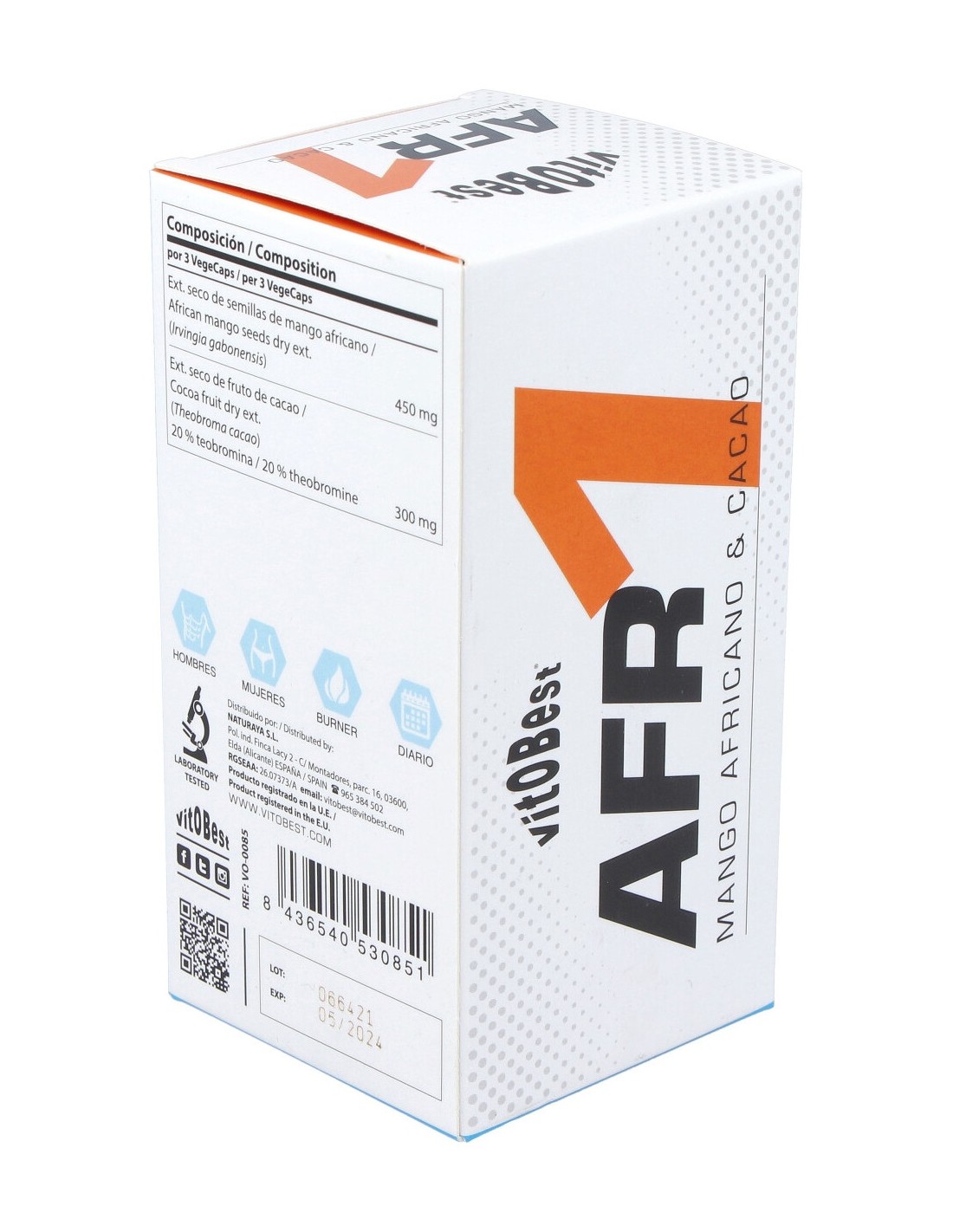 Composición:Extracto seco de semillas de mango africano (Irvingia gabonensis), extracto seco de fruto de cacao (Theobroma cacao), espesante (cápsula): hidroxipropilmetilcelulosa y antiaglomerantes: dióxido de silicio y talco.Por 3 cápsulas:Ext. seco de semillas de mango africano (Irvingia gabonensis) 450 mgExt. seco de fruto de cacao (Theobroma cacao) 20 % teobromina 300 mg