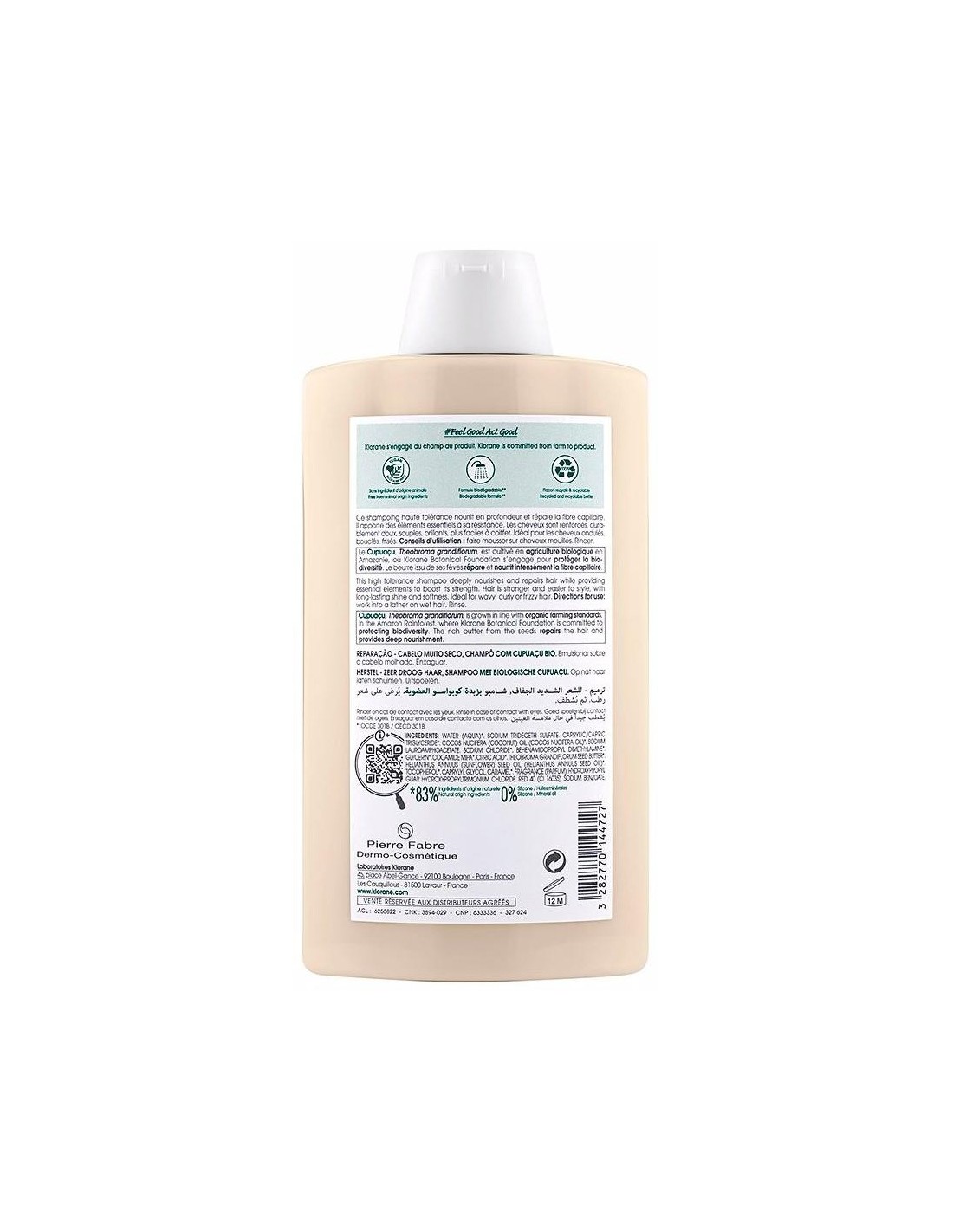 El champú reparador de Klorane limpia, repara el cabello muy seco y dañado. Es ideal para el cabello ondulado, rizado o encrespado. Enriquecido con cupuaçu BIO, su fórmula contiene un 83 % de ingredientes de origen natural para eliminar las impurezas y nutrir y reparar el cabello dañado.