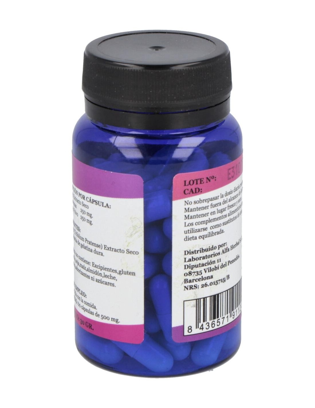 El trébol rojo es considerado como una de las fuentes más ricas de isoflavonas, que son químicos solubles en agua que actúan como los estrógenos. Por lo tanto, el trébol rojo se utiliza para los sofocos, síndrome premenstrual y la salud materna.Precauciones:No se han descrito.Composición:Trébol rojo (trifolium pratense) extracto seco y polvo, cápsula de gelatina dura.Por 1 cápsula:Trébol Rojo Extracto Seco 20% Isoflavonas….250 mg.Trébol Rojo Polvo…………………………………250 mg.