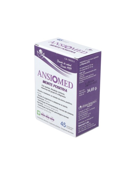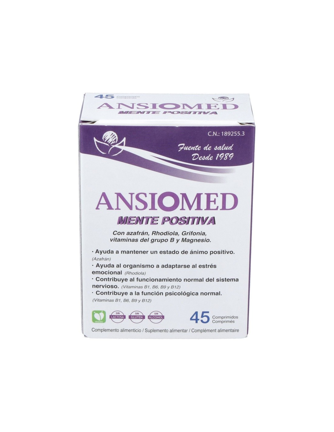 Ansiomed Mente Positiva 45comp es un complemento alimenticio a base de azafrán, rhodiola, grifonia, magnesio y vitaminas gel grupo B. Ayuda a mantener un estado de ánimo positivo y a reducir las tensiones. Indicado para personas sujetas a estrés.
