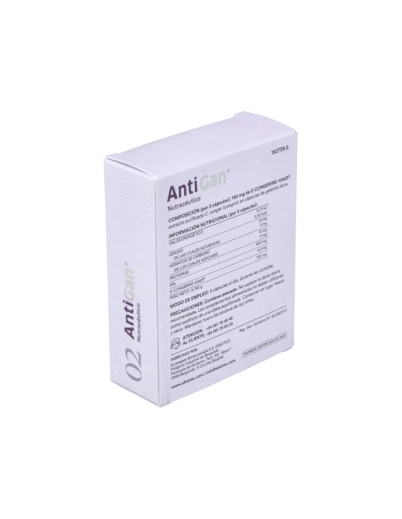 Suplemento de origen marino con ingredientes 100% naturales que se extrae de la especie marina Conger conger (European conger, Familia Congridae), pescado que pertenece al orden de los Anguiliformes. El extracto E-CONGERINE-10423® es la base estructural de AntiGan®, contiene todas las propiedades biológicas de la materia prima de la que deriva. La liofilización es la tecnología de base utilizada en la fabricación de AntiGan®. Esta tecnología permite la extracción y concentración de nutrientes y moléculas activas en una forma farmacéutica. La aplicación de esta tecnología permite que todas las propiedades bioactivas de la materia prima permanezcan inalteradas.Precauciones:No debe administrarse a personas con fenilcetonuria.Los complementos alimenticios no deben usarse como sustitutos de una dieta equilibrada ni de un modo de vida sano.No superar la dosis recomendada.Mantener fuera del alcance de los niños más pequeños.Composición:E-CONGERINE-10423® 100%. Componentes cápsula: Gelatina, E172, E171.Por 3 cápsulas:Extracto Liofilizado de C. conger (E-CONGERINE-10423®) 750 mg*Contiene pescado.Modo de empleo:Tomar 3 cápsulas al día, durante las comidas.