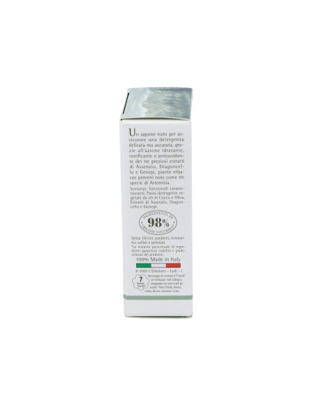 Jabón para una limpieza delicada gracias a la acción hidratante, tonificante y antioxidante de sus extractos de plantas. Sin siliconas, parabenos, tensioactivos, sulfatos ni vaselina.Precauciones:Mantener alejado del alcance de los niños.Composición:Pasta limpiadora vegetal de aceites de coco y oliva, extractos de absenta, estragón y genepi.INCI: Sodium Olivate, Sodium Cocoate, Aqua (Water), Glycerin, Parfum, Artemisia absinthium Extract, Artemisia dracunculus (Tarragon) Leaf/Stem Extract, Artemisia glacialis Extract, Benzyl Benzoate, Benzyl Salicylate, Citronellol, Coumarin, Eugenol, Geraniol, Hexyl Cinnamal, Hydroxycitronellal, Limonene, Linalool, Sodium Chloride, Tetrasodium Glutamate Diacetate, Potassium Sorbate, Sodium Benzoate.98% de ingredientes de origen naturalModo de empleo:Uso externo.