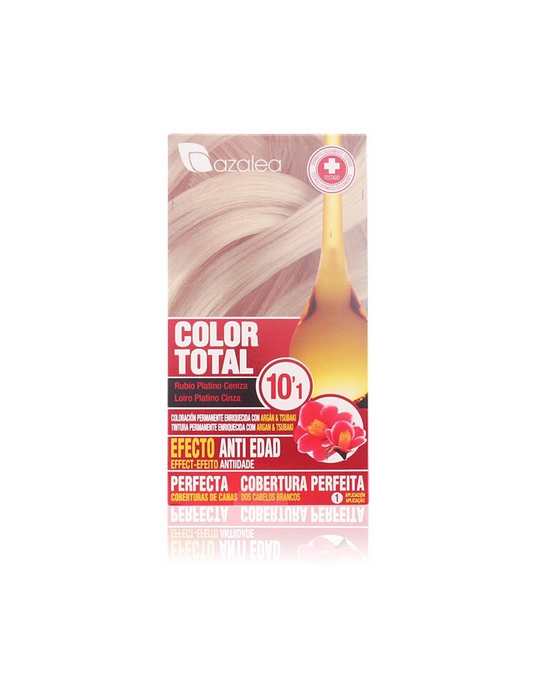 Productos de peluquería Azalea. COLOR TOTAL #10-rubio platino. Coloración permanente en crema de larga duración, enriquecida con aceite de argán y tsubaki. Ofrece una cobertura total de las canas y tiene un poder aclarante de 3 tonos.