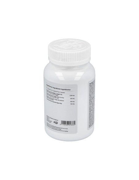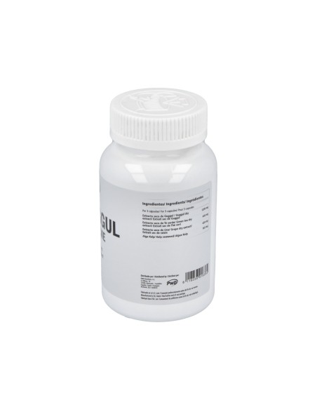 Extracto seco de Guggul (Commiphora mukul Engl., 2% Guggulsteronas) 1200mg, Extracto seco de Té verde (Camellia sinensis (L.) Kuntze, 60% Polifenoles) 450mg, Extracto seco de Uva (Vitis vinifera L., 90% Polifenoles) 450mg, Alga Kelp (Ascophyllum nodosum (L.) Le Jolis, 150mcg Yodo, 100% VRN)* 165mg, Antiaglomerante (Estearato de magnesio). Cápsula (Gelatina y Colorantes (E-171 y E-132)).