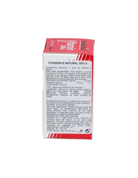 Complemento alimenticio a base de vitamina E natural. Contribuye a la protección de las células frente al daño oxidativo. Apto para vegetarianos.Precauciones:No se han descrito.Composición:Por 1 cápsula:Vitamina E natural (d-alfa tocoferol, 200 UI)……..134 mgAgente de carga (aceite de soja), cápsula [gelificantes (almidón modificado, glicerina vegetal, carragenano), regulador de acidez (fosfato disódico)].Modo de empleo:Adultos y jóvenes mayores de 12 años: Tomar 1 cápsula al día después de la comida. Si se requiere, puede incrementarse a 2 cápsulas al día.