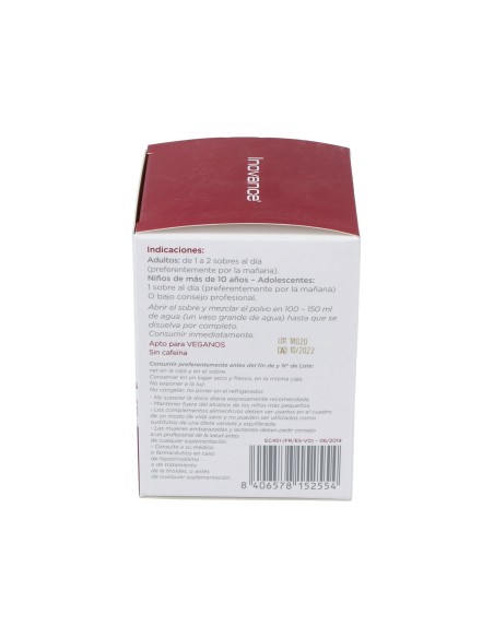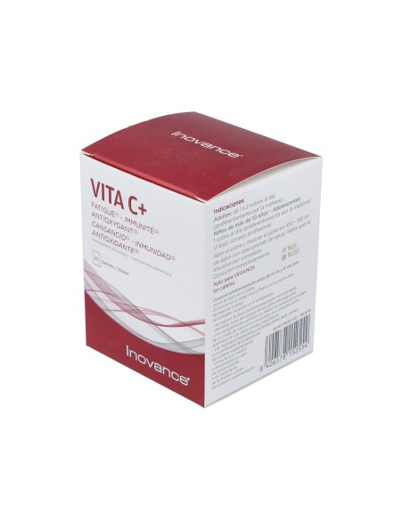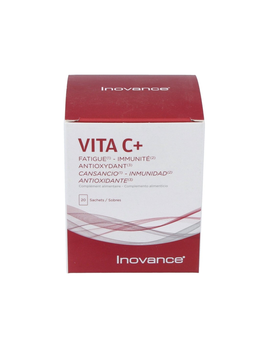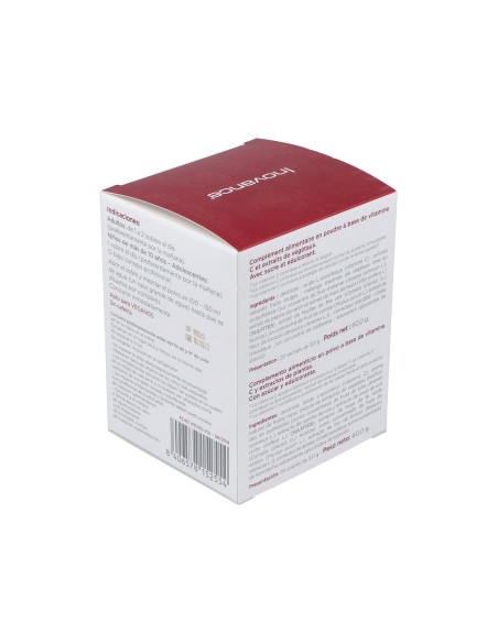 Complemento alimenticio en polvo a base de vitamina C y antioxidantes de extractos de plantas. La vitamina C contribuye a disminuir la fatiga y al funcionamiento normal del sistema inmunitario.Precauciones:No se han descrito.Composición:Dextrosa: ácido L-ascórbico (vitamina C): aroma natural de frutos rojos: mezcla de extractos de vegetales [extracto de té verde (Camelia sinensis (L.) Kuntze), extracto de semilla de uva (Vitis vinifera L.) (sulfitos), extracto de orujo de uva (Vitis vinifera L.) (sulfitos), concentrado de piña (Ananas comosus L.), concentrado de cereza (Prunus avium L.), extracto de brócoli (Brassica oleracea L.)]: citrato monosódico: zumo concentrado de remolacha: edulcorante (glucósidos de esteviol).Por 1 sobre:Vitamina C: 500 mg (625%) Mezcla de extractos de vegetales: 100 mg, de los cuales polifenoles: 20 mgModo de empleo:Tomar 1 sobre al día.
