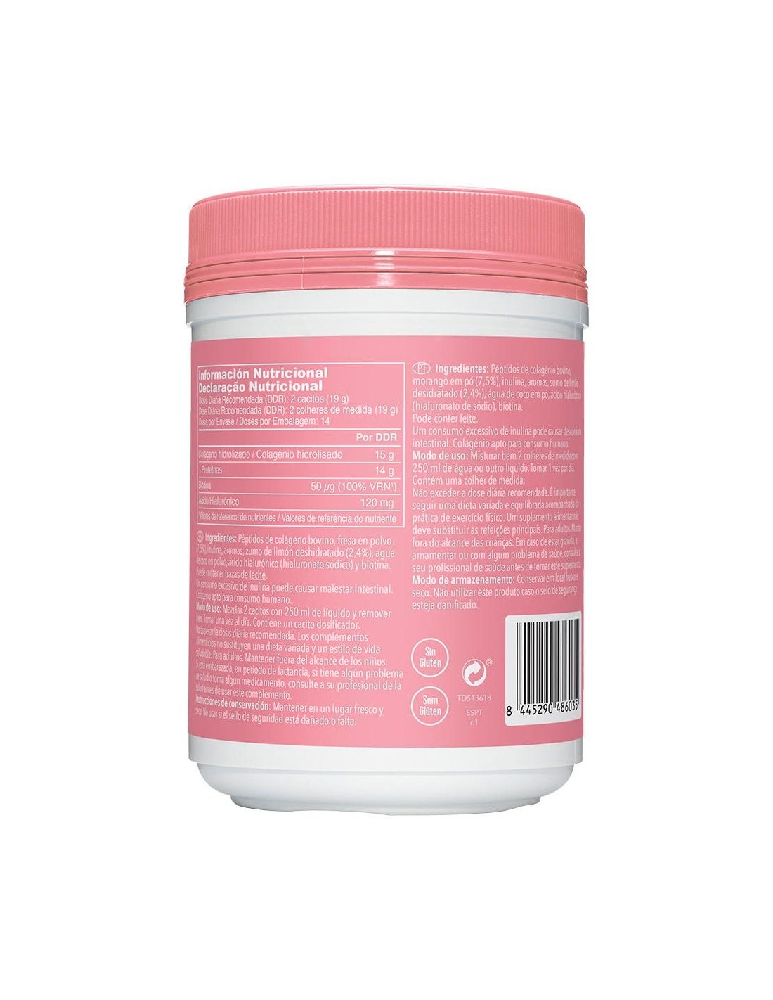 Fórmula avanzada con Ácido Hialurónico y Biotina entre los principios activos más populares y asociados con la belleza y cosmética, para dar respuesta a aquellos consumidores que buscan un plus más (no solo colágeno). La biotina contribuye a mantener pelo y piel en condiciones normales. Sabor a fresa-limón.Precauciones:Los complementos alimenticios no deben usarse como sustitutos de una dieta equilibrada ni de un modo de vida sano. No superar la dosis recomendada. Mantener fuera del alcance de los niños más pequeños.Composición:Péptidos de colágeno bovino, fresa en polvo (7,5%), inulina, aromas, zumo de limón deshidratado (2,4%), agua de coco en polvo, ácido hialurónico (hialuronato sódico) y Biotina. Por 2 cacitos: 15 g de Péptidos de Colágeno 120 mg de Ácido Hialurónico 50 µg de Biotina *Puede contener trazas de leche.Modo de empleo:Disolver en té, agua o smoothies.