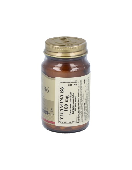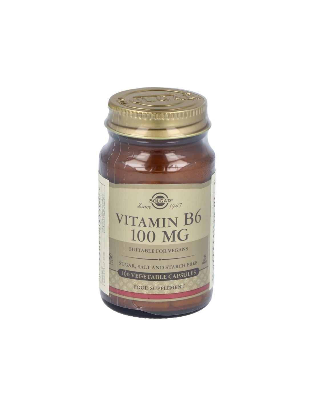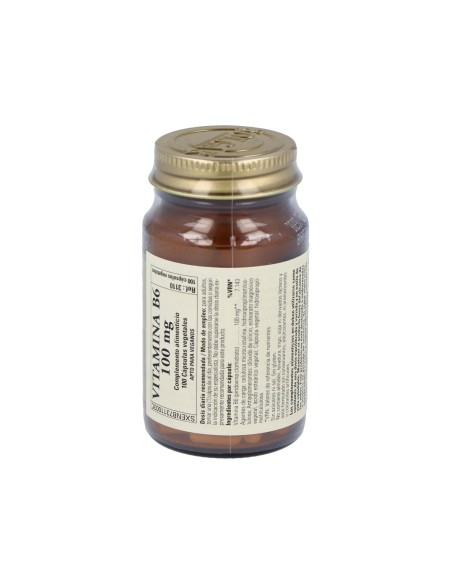 La piridoxina cumple funciones esenciales en el organismo como la síntesis de carbohidratos, el procesamiento de grasas y proteínas, la creación de anticuerpos, ayudar en el sistema nervioso, etc. Producto apto para veganos.Precauciones:No recomendado para niños.Los complementos alimenticios no deben usarse como sustitutos de una dieta equilibrada ni de un modo de vida sano.No superar la dosis recomendada.Mantener fuera del alcance de los niños más pequeños.Composición:Por 1 cápsula:Vitamina B6 (piridoxina hidrocloruro)…..100 mgCubierta de la cápsula vegetal: hidroxipropilmetilcelulosa: antiaglomerantes: estearato de magnesio vegetal, ácido esteárico vegetal, dióxido de silicio: diluyente: celulosa microcristalina.Modo de empleo:Tomar 1 cápsula al día, preferentemente con las comidas.