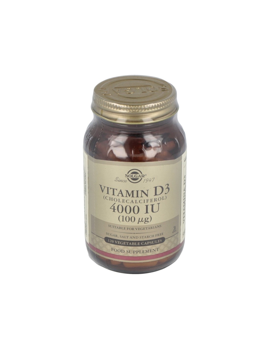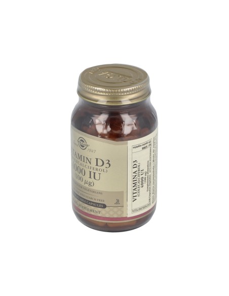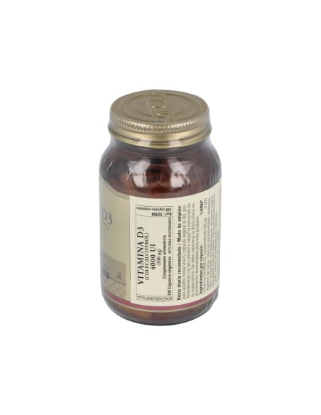 Vitamina necesaria para la síntesis del calcio y para procurar una correcta protección de la estructura ósea. Apto para vegetarianos.Precauciones:No recomendado para niños.Composición:Por 1 cápsula:Vitamina D3 (4000 UI, colecalciferol)… 100 µg Diluyentes: celulosa microcristalina, maltodextrina: cubierta de la cápsula vegetal: hidroxipropilmetilcelulosa: antiaglomerante: estearato de magnesio vegetal.Modo de empleo:Tomar 1 al día, preferentemente con las comidas o según indicación de un especialista.