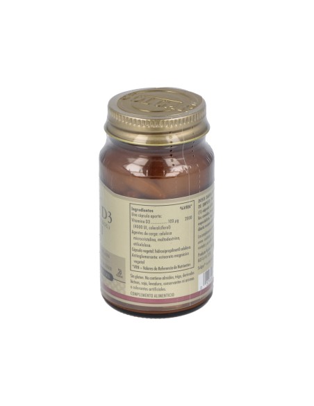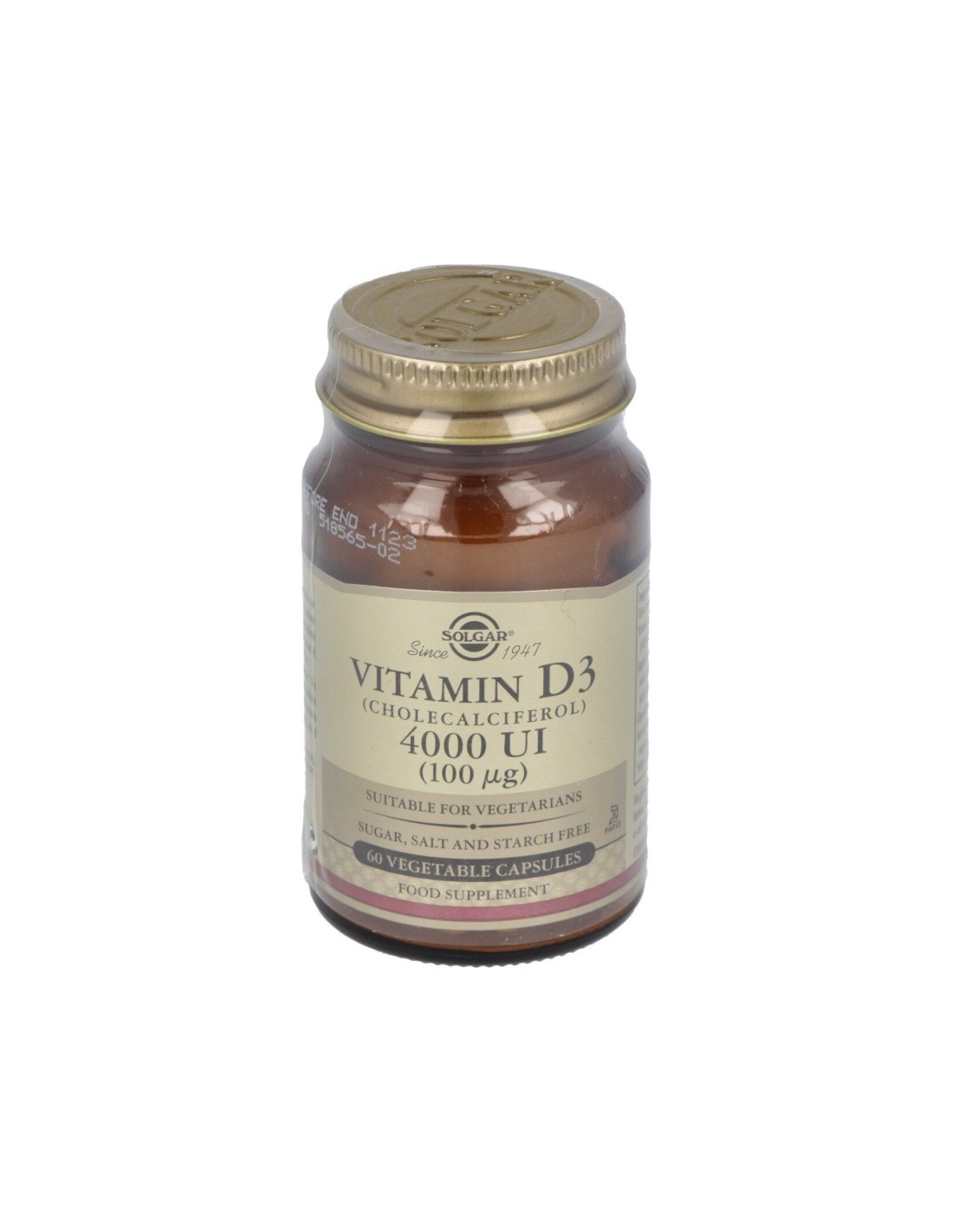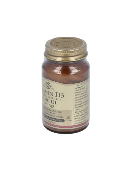 Vitamina necesaria para la síntesis del calcio y para apoyar una correcta protección de la estructura ósea. Apto para vegetarianos.Precauciones:No recomendado para niños.Los complementos alimenticios no deben usarse como sustitutos de una dieta equilibrada ni de un modo de vida sano.No superar la dosis recomendada.Mantener fuera del alcance de los niños más pequeños.Composición:Por 1 cápsula:Vitamina D3 (4000 UI, colecalciferol)… 100 µg Diluyentes: celulosa microcristalina, maltodextrina: cubierta de la cápsula vegetal: hidroxipropilmetilcelulosa: antiaglomerante: estearato de magnesio vegetal.Modo de empleo:Tomar 1 al día, preferentemente con las comidas o según indicación de un especialista.