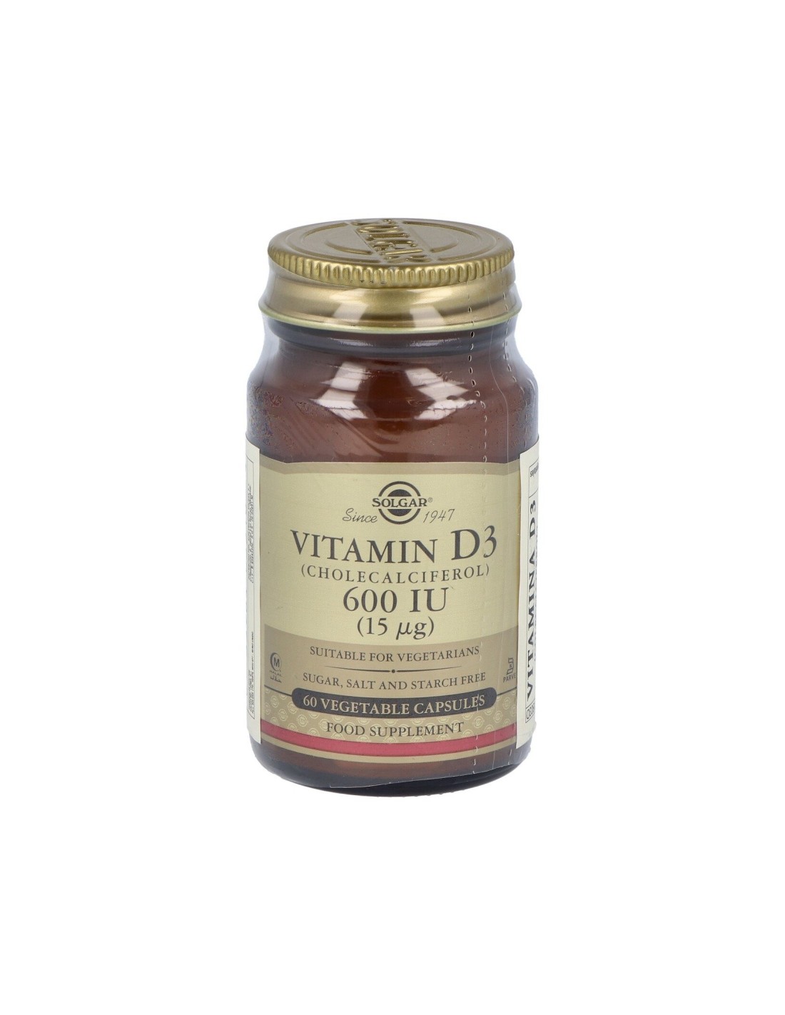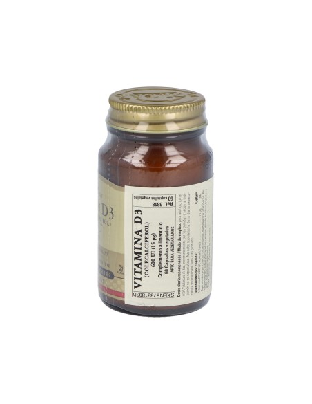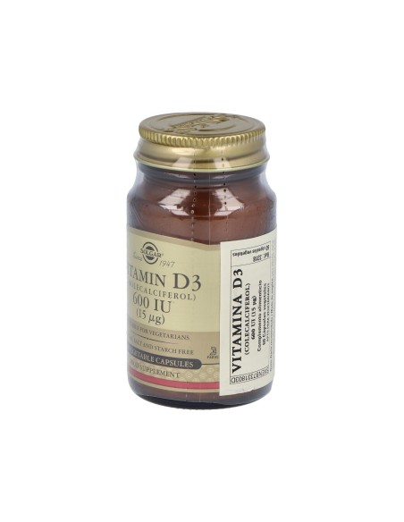 La vitamina D3 ayuda a transportar el calcio y otros minerales esenciales a su destino, en caso del calcio a los huesos. Producto apto para vegetarianos.Precauciones:No recomendado para niños.Los complementos alimenticios no deben usarse como sustitutos de una dieta equilibrada ni de un modo de vida sano.No superar la dosis recomendada.Mantener fuera del alcance de los niños más pequeños.Composición:Por 1 cápsula:Vitamina D3 (600 UI, colecalciferol) ….15 µg Diluyentes: celulosa microcristalina, maltodextrina: cubierta de la cápsula vegetal: hidroxipropilmetilcelulosa: antiaglomerantes: estearato de magnesio vegetal, dióxido de silicio.Modo de empleo:Tomar 1 cápsula al día, preferentemente con las comidas o según indicación de un espcialista.