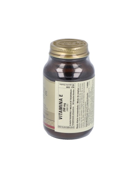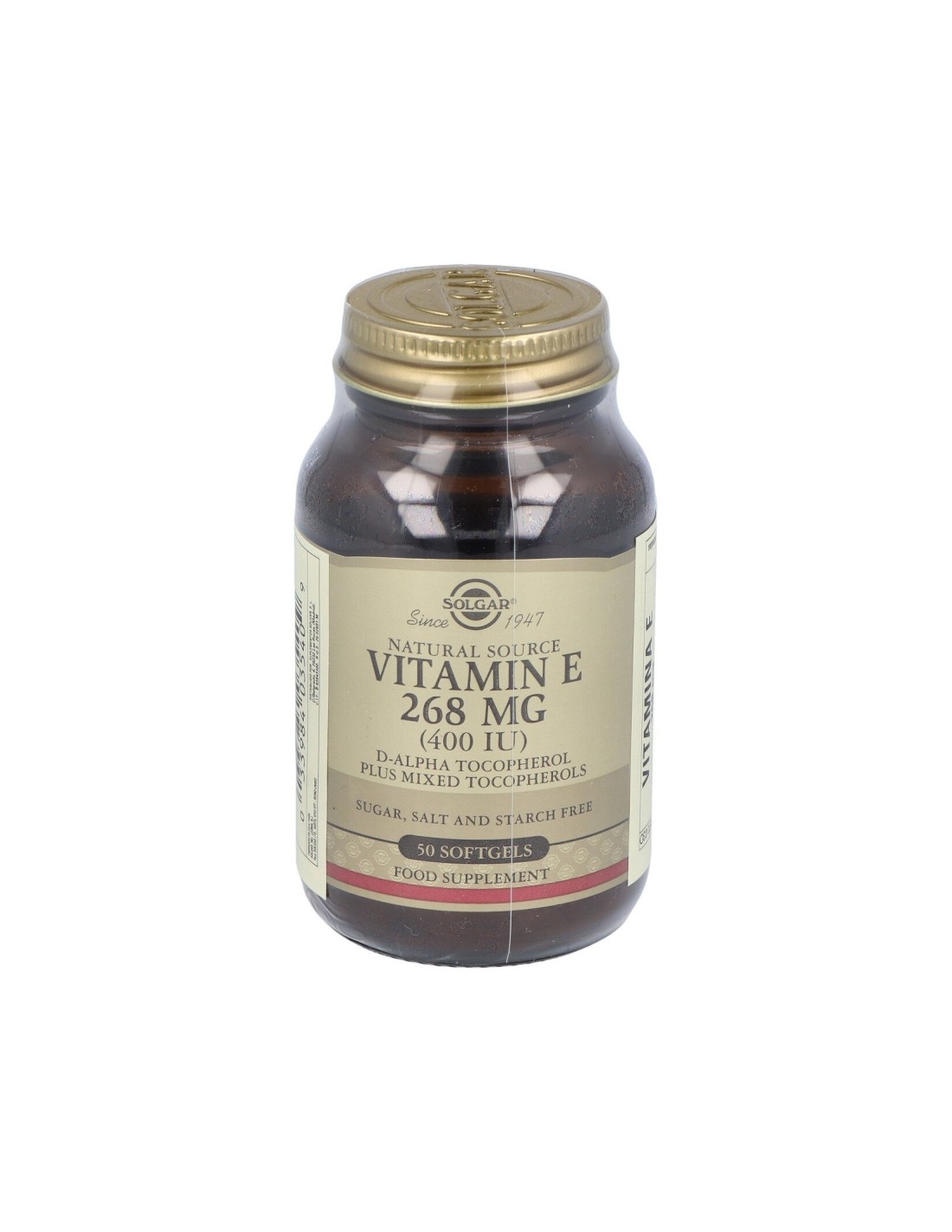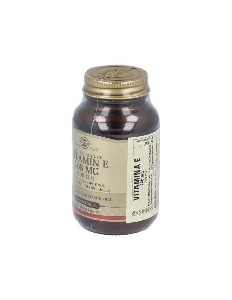 La vitamina E contribuye a proteger las células del daño oxidativo.Precauciones:No recomendado para niños.Los complementos alimenticios no deben usarse como sustitutos de una dieta equilibrada ni de un modo de vida sano.No superar la dosis recomendada.Mantener fuera del alcance de los niños más pequeños.Composición:Por 1 cápsula:Vitamina E (400 UI, D-alfa-tocoferol)…………. 268 mg a-TE Mezcla de tocoferoles (tocoferoles D-beta, D-gamma, D-delta, D-alfa)…18,5 mgCubierta de la cápsula blanda: gelatina (de origen bovino), glicerina vegetal (de aceite de semilla de palma y aceite de coco): aceite de cártamo.Modo de empleo:Tomar 1 cápsula al día, preferentemente con las comidas o según indicación de un especialista.