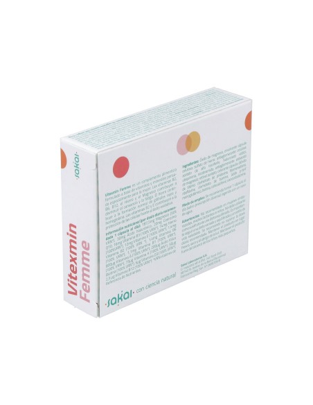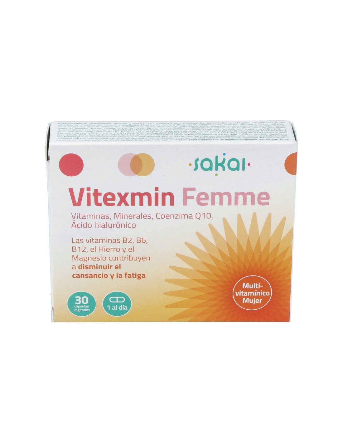 Sakai Vitexmin Femme 30cáps es un complemento alimenticio a base de vitaminas, minerales, coenzima Q10 y ácido hialurónico, esta formula colabora a nutrir la piel desde dentro.