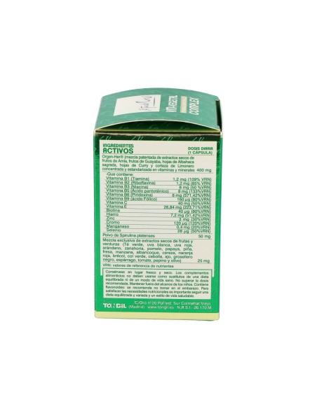 Aporte extra de minerales y vitaminas para reforzar y proteger al organismo.Precauciones:No se han descrito.Composición:Por 1 cápsula:Orgen-Her® (mezcla patentada de extractos secos de frutos de Amla, frutos de Guayaba, hojas de Albahaca sagrada, hojas de Curry y corteza de Limonero concentrada y estandarizada en vitaminas y minerales)……400 mgque contiene:Vitamina B1 (Tiamina) …………………………………….1,2 mgVitamina B2 (Riboflavina)……………………………….. 1,2 mg Vitamina B3 (Niacina) …………………………………….8 mg Vitamina B5 (Ácido pantoténico)……………………….8 mg Vitamina B6 (Piridoxina)………………………………….8 mg Vitamina B9 (ácido Fólico)………………………………160 µgVitamina C …………………………………………………40 mg Vitamina E………………………………………………… 26,84 mg Biotina……………………………………………………… 40 µg Hierro,………………………………………………………7,2 mg Zinc ………………………………………………………….3 mgCromo ………………………………………………………120 µgManganeso ………………………………………………..0,4 mgSelenio……………………………………………………..28 µg Polvo de Spirulina plantensis …………………………50 mg Mezcla exclusiva de extractos secos de frutas y verduras (Té verde, uva blanca, uva roja, arándano, zanahoria, pomelo, papaya, piña, fresa, manzana, albaricoque, cereza, naranja roja, brécol, col verde, cebolla, ajo, grosellero negro, espárrago, tomate, pepino y olivo) ………………………………..25 mg Cápsula vegetal y agente de carga (maltodextrina).Modo de empleo:Tomar 1 cápsula al día, preferentemente con la comida.