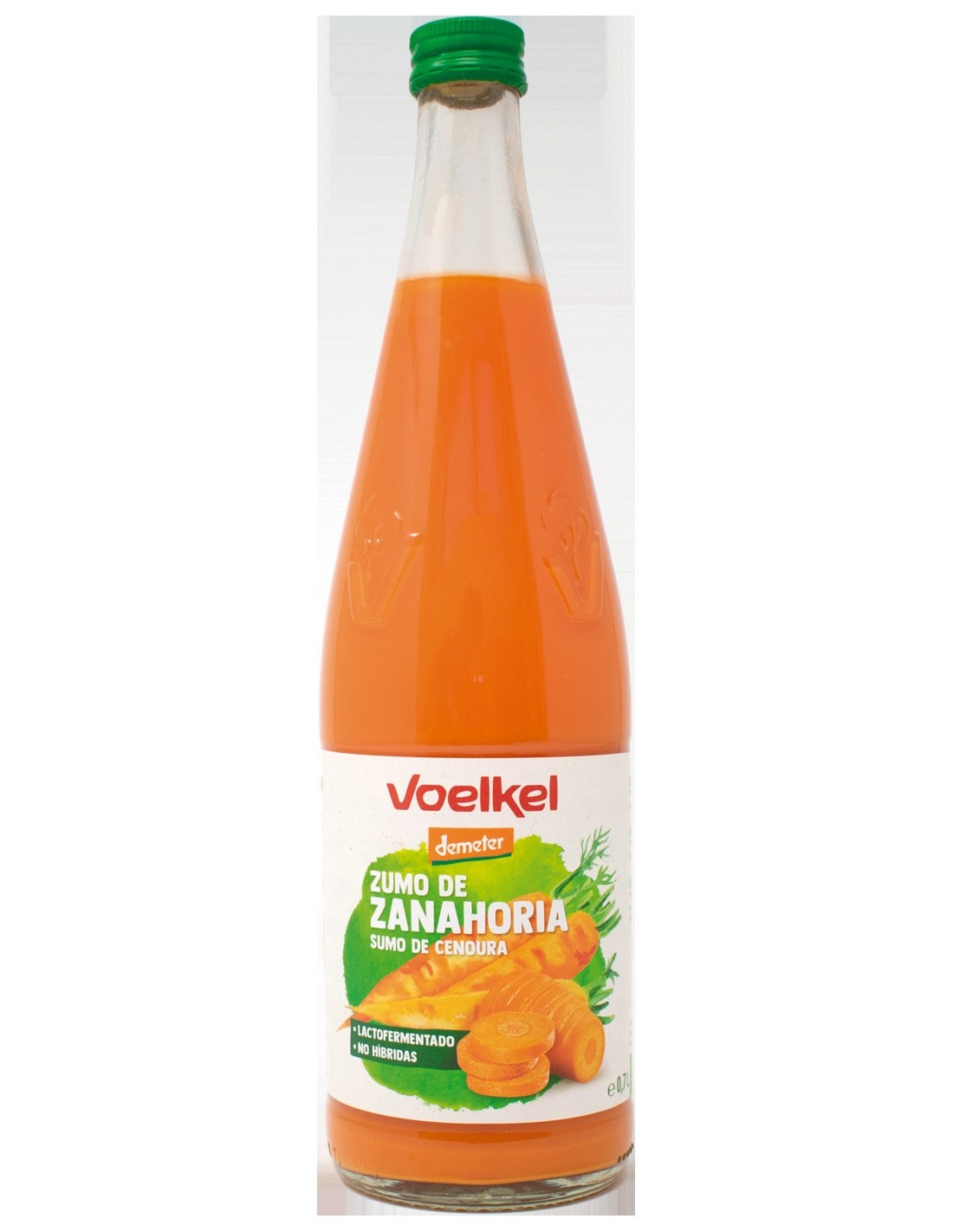 Para este zumo lactofermentado de zanahoria, se utilizan solo materias primas Demeter, procedentes de agricultura biodinámica. Alimento vegano.Precauciones:No se han descrito.Composición:Zumo de zanahoria (lactofermentado (L+))*º. Valor nutricional por 100 g:Valor energético kcal.35/kJ.146Grasas:0.100 gde las cuales, saturadas 0.000 gHidratos de carbono 7.800 gde los cuales, azúcares 7.800 gProteínas 0.100 gSal 0.000 g(º)= demeter.(*)= De agricultura ecológica.