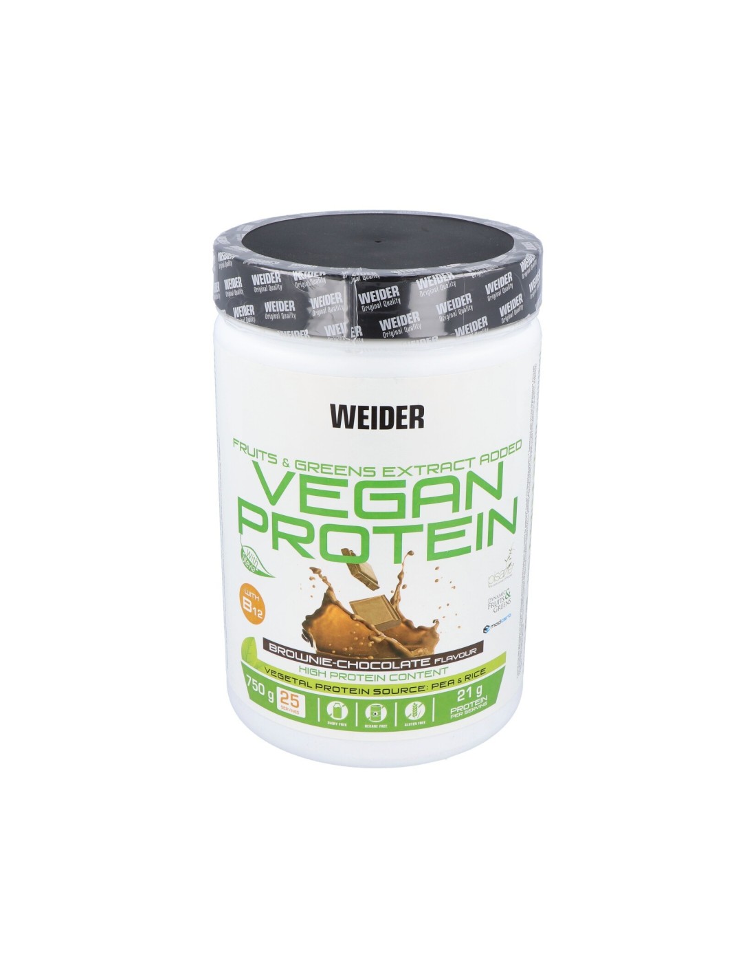 82% Aislado de proteína de guisante ( 100% Pisane® C9), 10% cacao en polvo bajo en grasa (Theobroma cacao L.), 3% aislado de proteína de arroz, aroma, 2%ModCarb TM (salvado de avena (sin gluten), quinoa , amaranto , alforfón (sin gluten), mijo ), aroma natural, 0,1% Fruit&GreensTM extract ( paprika, jengibre, brócoli , espinaca, col rizada , col , té verde , frambuesa , plátano , Kiwi , mango , ciruela, lima, arándano, piña, naraja, pomelo rosa, cereza, limón, coliflor, trigo germinado (sin gluten), alfalfa, spirulina, chlorella, maltodextrina, espesante: goma arábiga; almidón de maíz), edulcorante: glucósidos de esteviol (extracto de stevia); cloruro de sodio.